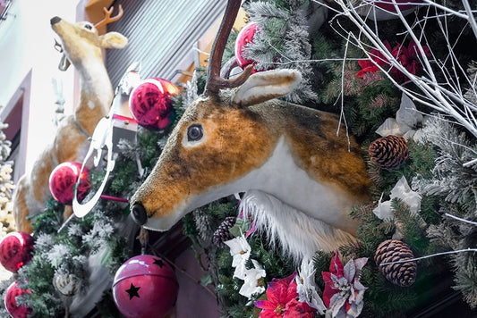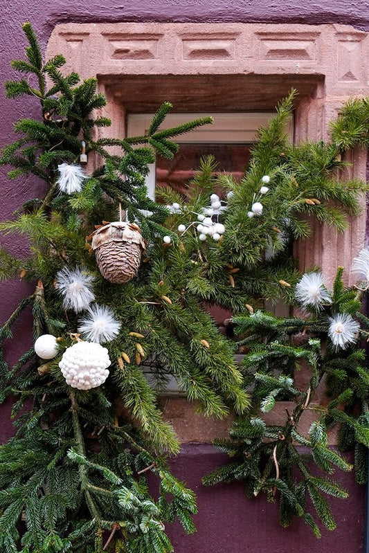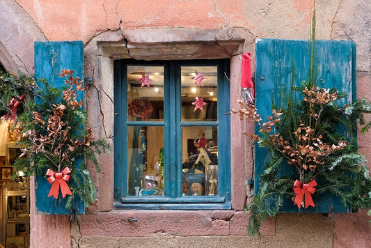 Riquewihr-France Village established 1400s in Alsace Region Window decorated Christmas ornaments White Modern Wood Framed Art Print with Double Matting by McRoberts, Julien