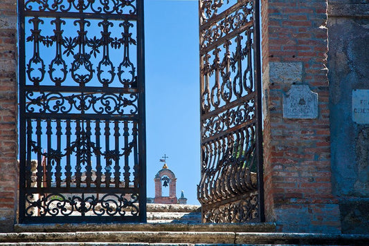 Italy-Tuscany-Montepulciano The wrought iron gate leading to the cemetery the Church of San Biaggio White Modern Wood Framed Art Print with Double Matting by Eggers, Julie
