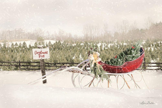 Red Sleigh at Tree Farm White Modern Wood Framed Art Print with Double Matting by Deiter, Lori