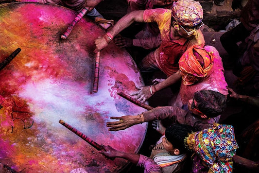 Holi Drummers In Barsana Black Ornate Wood Framed Art Print with Double Matting by Rana, Ajit