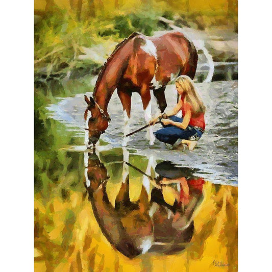 Girl with Drinking Horse Gold Ornate Wood Framed Art Print with Double Matting by Medeiros, Celito