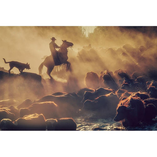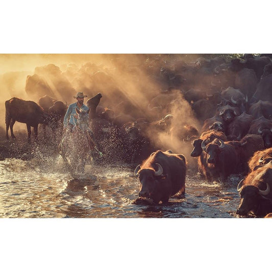 The Buffalo Shepherd Gold Ornate Wood Framed Art Print with Double Matting by Aktar, Meric