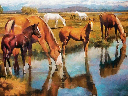 Drinking Horses White Modern Wood Framed Art Print with Double Matting by Medeiros, Celito