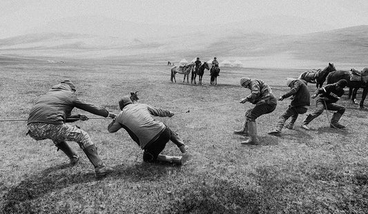 Dark horse and Damavand White Modern Wood Framed Art Print with Double Matting by Babaei, Hosein