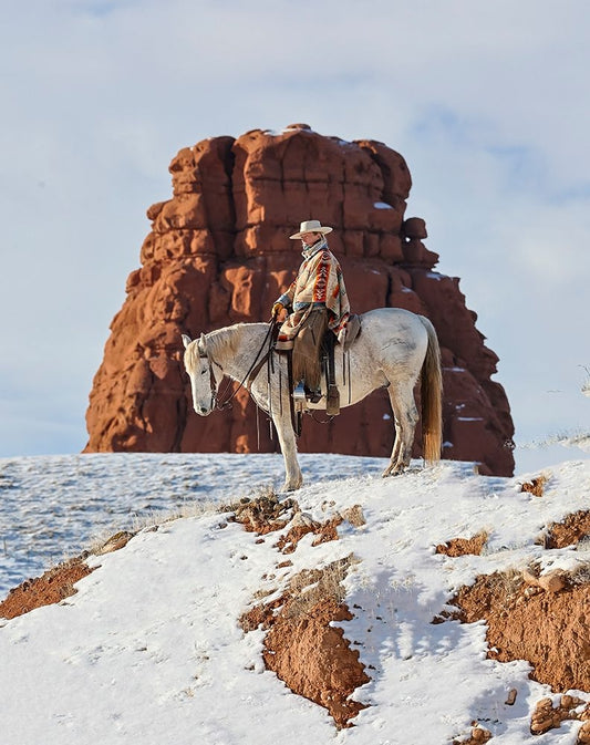 USA- Wyoming. Hideout Ranch cowgirl on horseback riding on ridgeline snow. White Modern Wood Framed Art Print with Double Matting by Gulin, Darrell