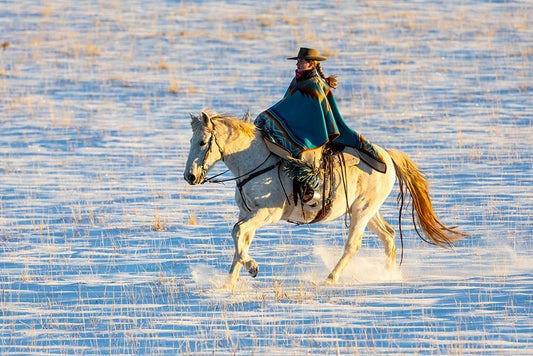 USA- Shell- Wyoming. Hideout Ranch cowgirl riding her horse in the snow. White Modern Wood Framed Art Print with Double Matting by Gulin, Darrell