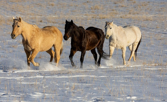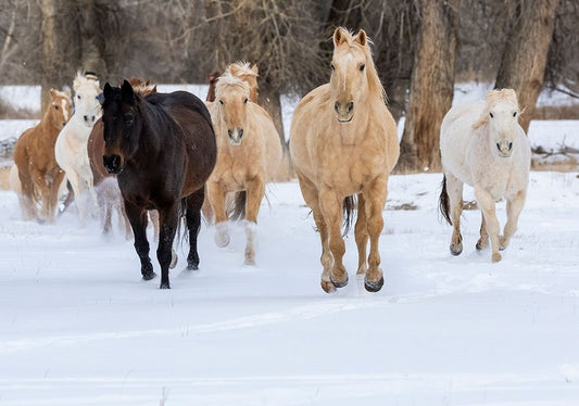 USA- Shell- Wyoming. Hideout Ranch with small herd of horses in snow. White Modern Wood Framed Art Print with Double Matting by Gulin, Darrell