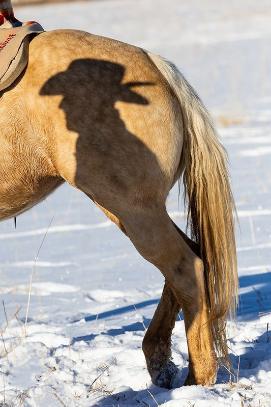 USA- Shell- Wyoming. Hideout Ranch Shadow of cowhand with hat on side of horse. White Modern Wood Framed Art Print with Double Matting by Gulin, Darrell