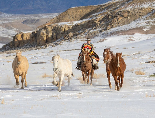 USA- Shell- Wyoming. Hideout Ranch cowboy riding and herding horses in snow. White Modern Wood Framed Art Print with Double Matting by Gulin, Darrell