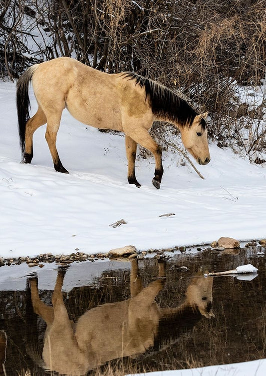 USA- Shell- Wyoming. Hideout Ranch lone horse in reflection Shell creek. White Modern Wood Framed Art Print with Double Matting by Gulin, Darrell