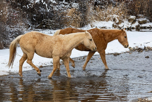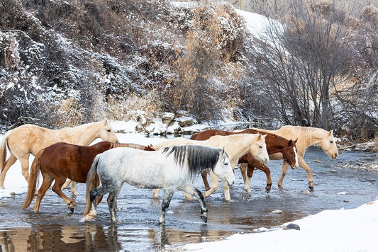 USA- Shell- Wyoming. Hideout Ranch horses in reflection Shell Creek. White Modern Wood Framed Art Print with Double Matting by Gulin, Darrell