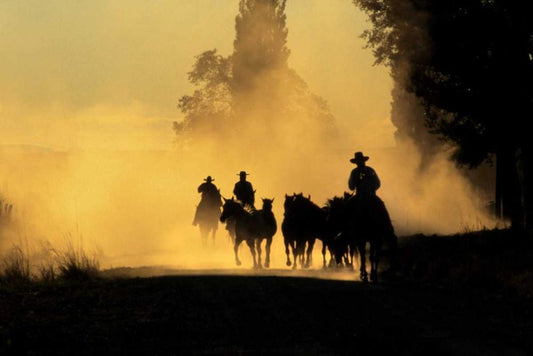 OR, Burns Cowboys driving wild horses on a road White Modern Wood Framed Art Print with Double Matting by Terrill, Steve