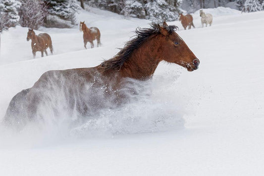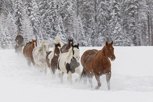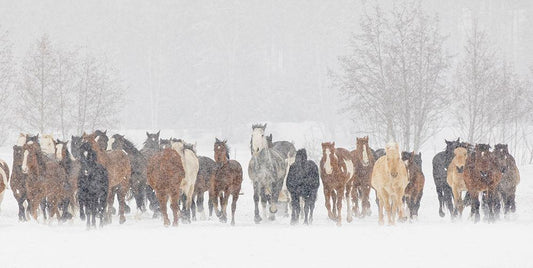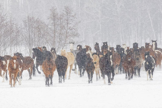 Horses running through fresh snow during roundup-Kalispell-Montana White Modern Wood Framed Art Print with Double Matting by Jones, Adam