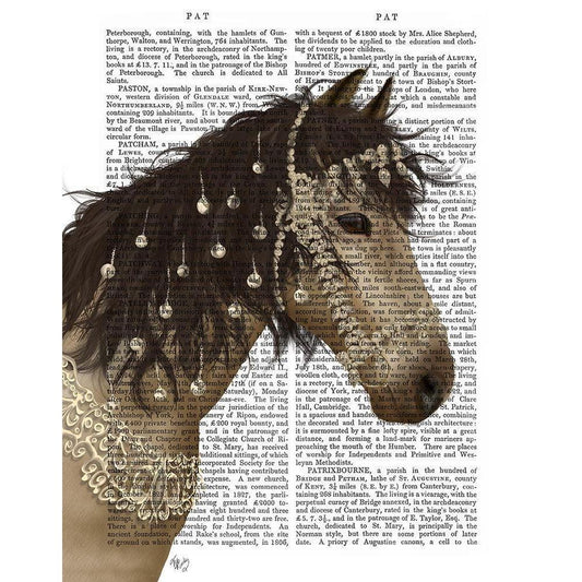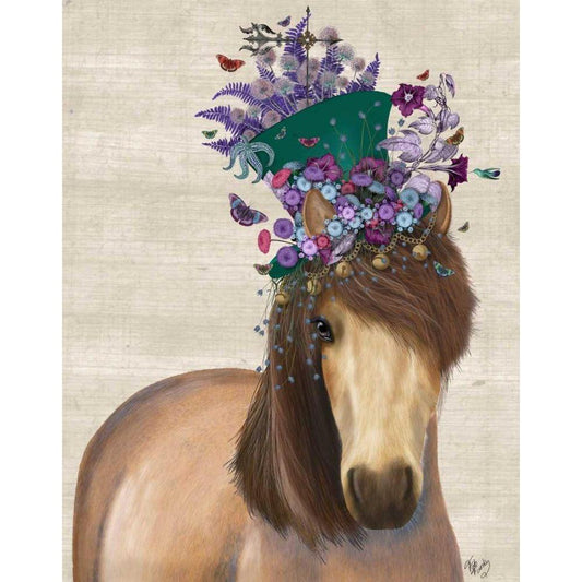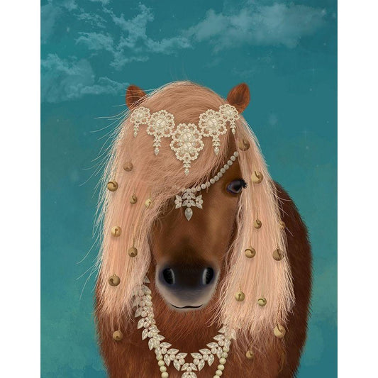 Horse Brown Pony with Bells, Portrait White Modern Wood Framed Art Print by Fab Funky