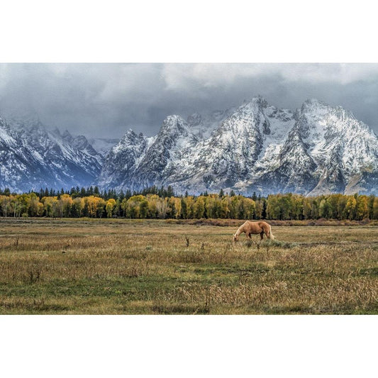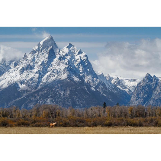 A Horse In Front Of The Grand Teton White Modern Wood Framed Art Print by Galloimages Online