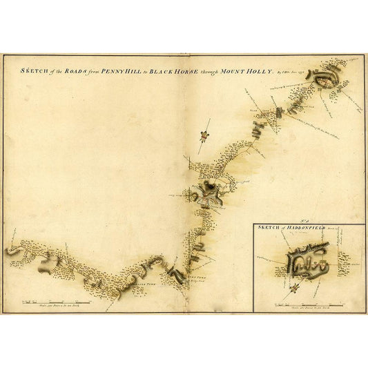 Haddonfield Mount Holly from Pennyhill to the Black Horse Pike 1778 Gold Ornate Wood Framed Art Print with Double Matting by Vintage Maps