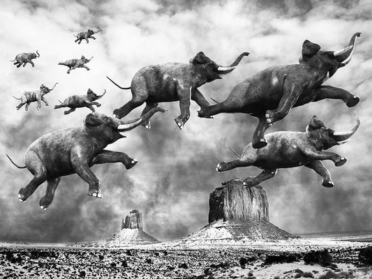 Flying Elephants White Modern Wood Framed Art Print with Double Matting by Anonymous