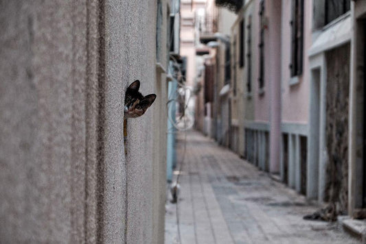 Dantel Street Cat White Modern Wood Framed Art Print with Double Matting by Ayer, Ali