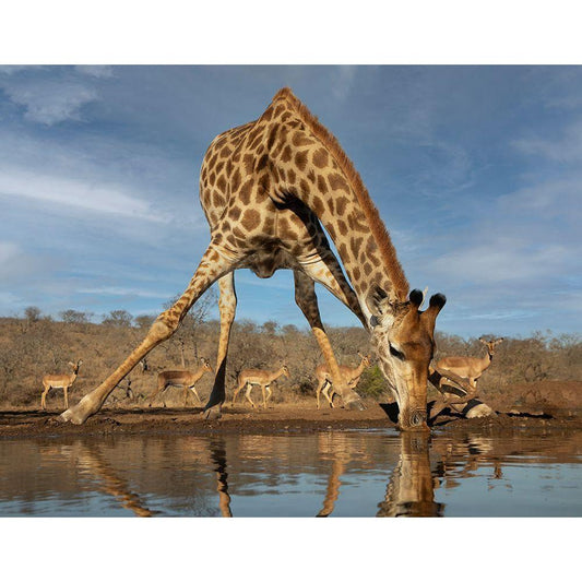Giraffe Having A Drink Black Modern Wood Framed Art Print by D Lester, Linda