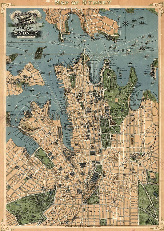 Aeroplane map of Sydney Australia 1922 White Modern Wood Framed Art Print with Double Matting by Vintage Maps