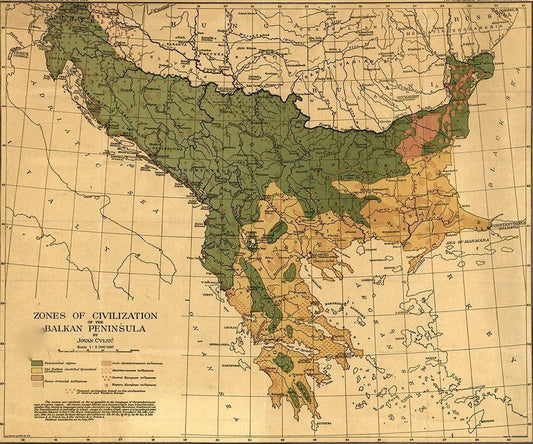 Balkan Zones of Civilization 1918 White Modern Wood Framed Art Print with Double Matting by Vintage Maps