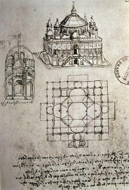 Sketch of a Square Church with Central Dome and Minaret White Modern Wood Framed Art Print with Double Matting by Da Vinci, Leonardo