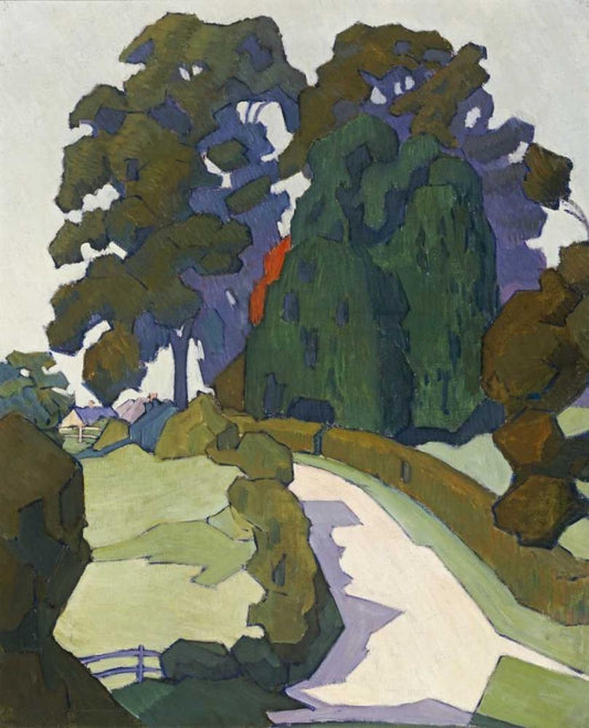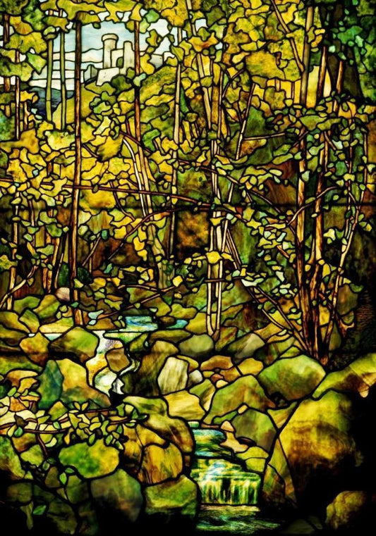 A Leaded Glass Window of a Woodland Scene White Modern Wood Framed Art Print with Double Matting by Tiffany Studios