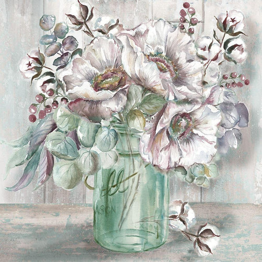 Blush Poppies and Eucalyptus in Mason Jar White Modern Wood Framed Art Print with Double Matting by Tre Sorelle Studios
