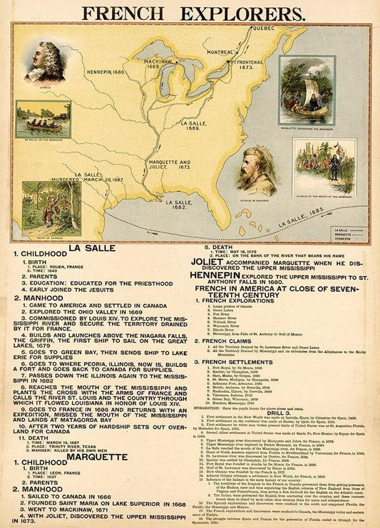 French Explorers La Salle Marquette Joliet and Hennepin White Modern Wood Framed Art Print with Double Matting by Vintage Maps