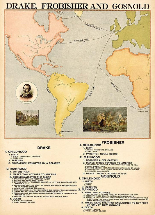 English Explorers Frobisher Drake and Gosnold White Modern Wood Framed Art Print with Double Matting by Vintage Maps