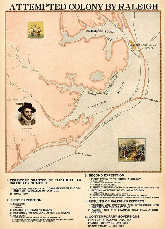 Attempted Colony by Raleigh White Modern Wood Framed Art Print with Double Matting by Vintage Maps