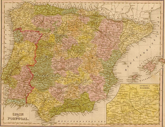 Spain and Portugal White Modern Wood Framed Art Print with Double Matting by Vintage Maps