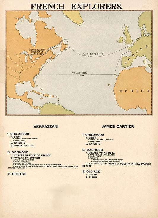 French Explorers Cartier and Verrazano White Modern Wood Framed Art Print with Double Matting by Vintage Maps