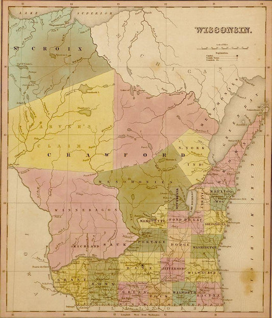 Wisconsin 1844 White Modern Wood Framed Art Print with Double Matting by Vintage Maps