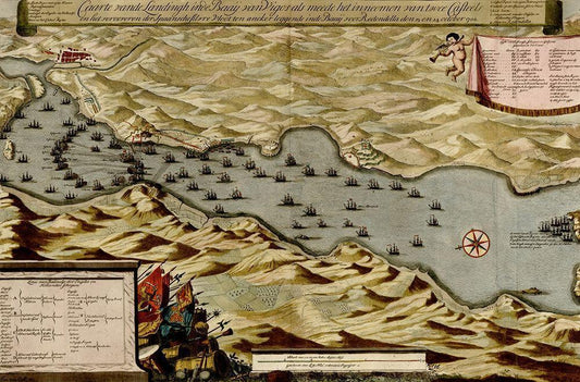 Vigos Spain 1700 Battle of Vigo Bay White Modern Wood Framed Art Print with Double Matting by Vintage Maps