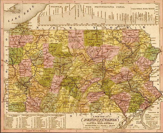 Pennsylvania 1844 White Modern Wood Framed Art Print with Double Matting by Vintage Maps