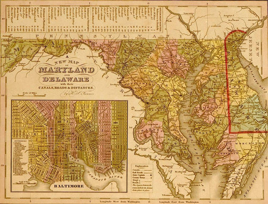 Maryland Delaware and Baltimore 1844 White Modern Wood Framed Art Print with Double Matting by Vintage Maps