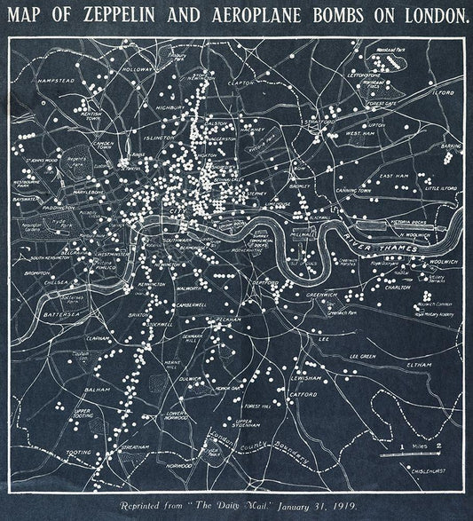 Map of Zeppelin and aeroplane bombs on London White Modern Wood Framed Art Print with Double Matting by World War 1 Photograph