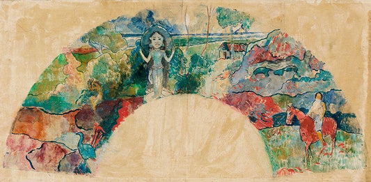 Design for a Fan Featuring a Landscape and a Statue of the Goddess Hina White Modern Wood Framed Art Print with Double Matting by Gauguin, Paul