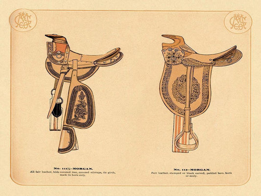 Saddles and Tack: Morgan Saddles #1 White Modern Wood Framed Art Print with Double Matting by Unknown