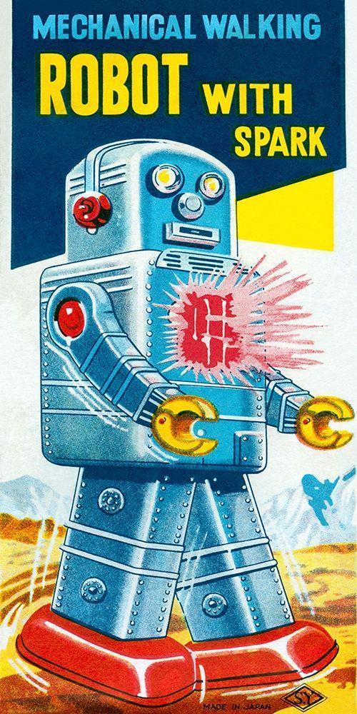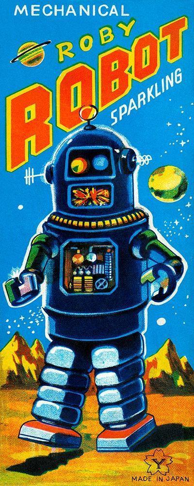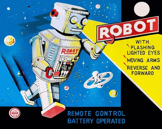 Robo - Movido a Pilhas White Modern Wood Framed Art Print with Double Matting by Retrobot
