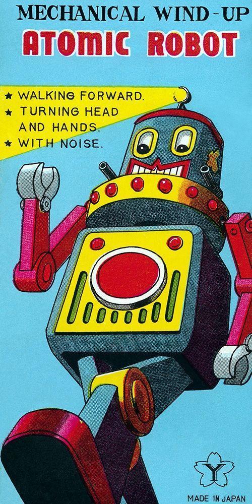 Mechanical Wind-Up Atomic Robot White Modern Wood Framed Art Print with Double Matting by Retrobot