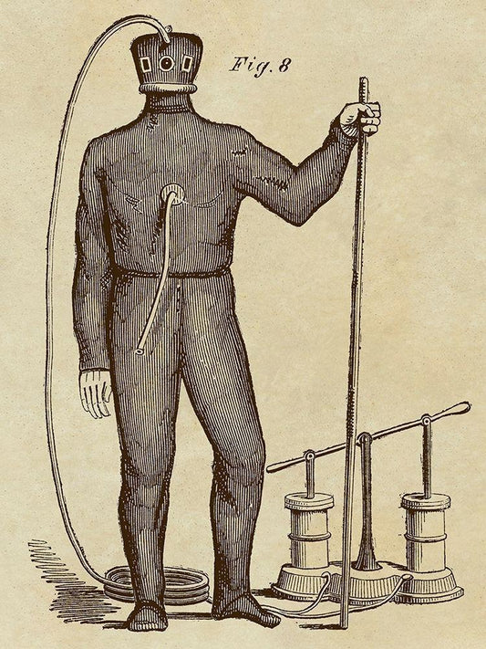 Diving Gear with Suit and Air Pump White Modern Wood Framed Art Print with Double Matting by Inventions