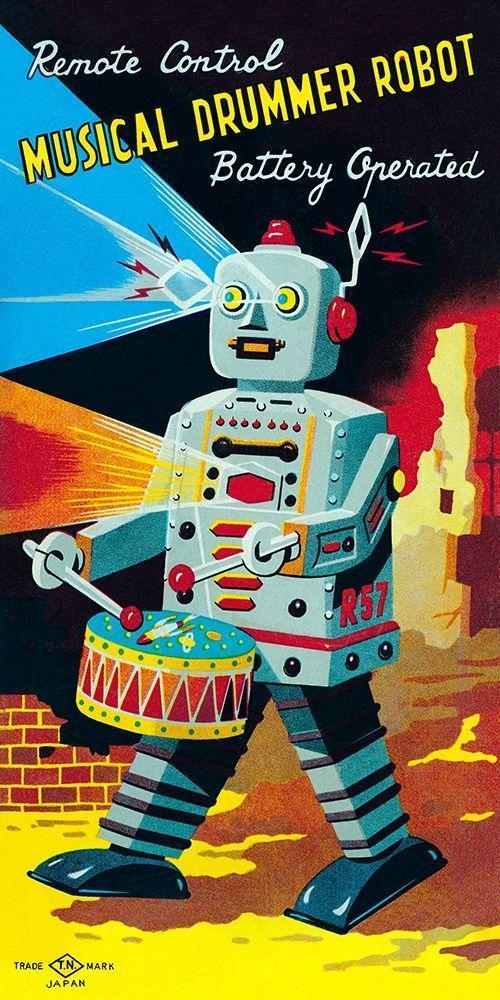 Musical Drummer Robot White Modern Wood Framed Art Print with Double Matting by Retrobot
