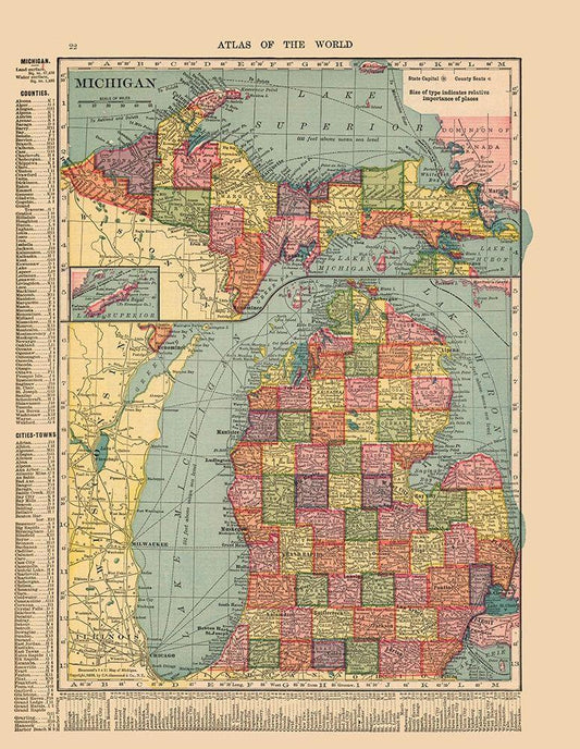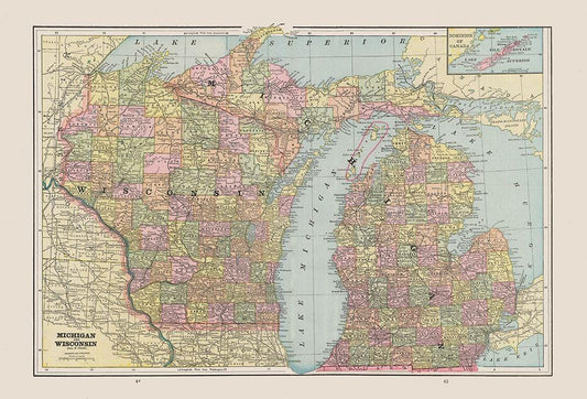 Michigan, Wisconsin - Cram 1892 White Modern Wood Framed Art Print with Double Matting by Cram