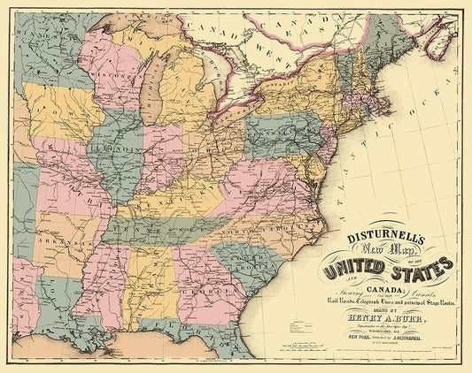 US East Railroad, Telegraph, Stage Coach 1850 White Modern Wood Framed Art Print with Double Matting by Disturnell