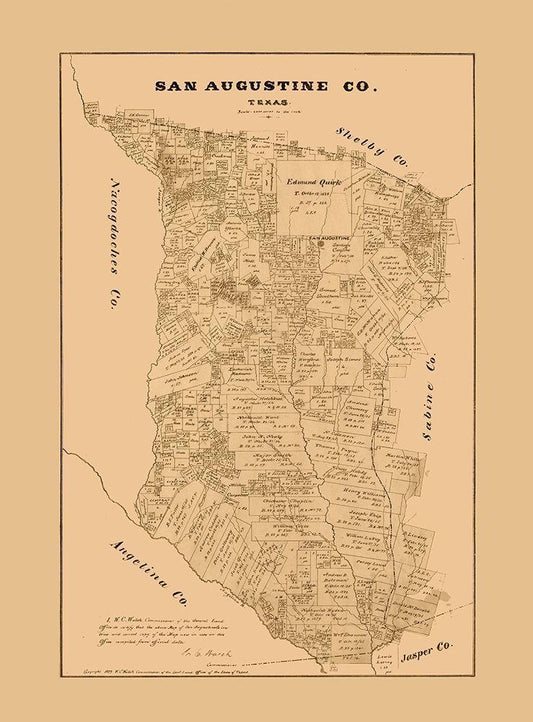 San Augustine County Texas - Walsh 1879 White Modern Wood Framed Art Print with Double Matting by Walsh