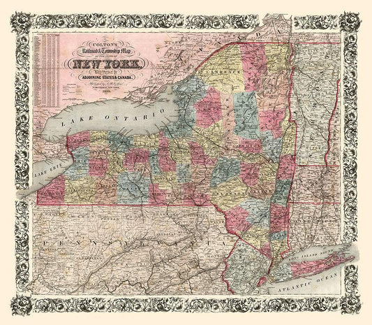 New York Railroads- Colton 1852 White Modern Wood Framed Art Print with Double Matting by Colton