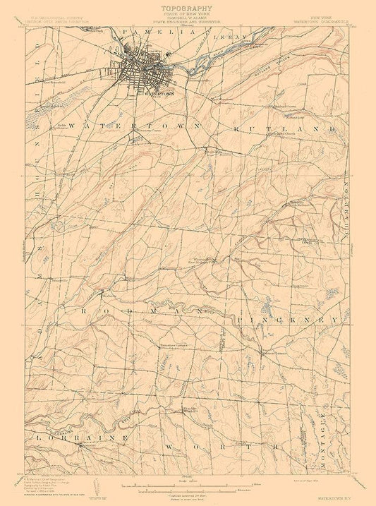 Watertown New York Quad - USGS 1909 White Modern Wood Framed Art Print with Double Matting by USGS