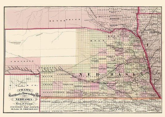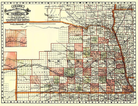 Nebraska Railroads and Townships - Cram 1879 White Modern Wood Framed Art Print with Double Matting by Cram